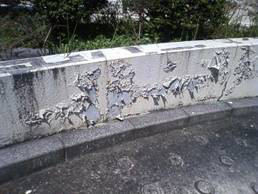 上部に溜まった水が溢れ、壁面に流れてきたことによって、コンクリートの表面が削れてしまった症例。